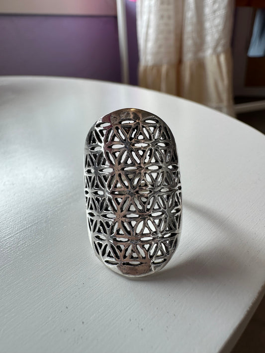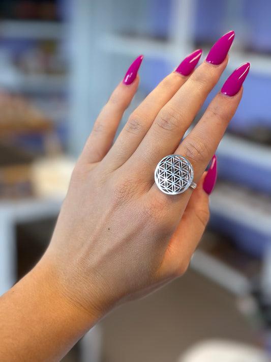 Justerbar ring - livets blomst sølvfarget rund