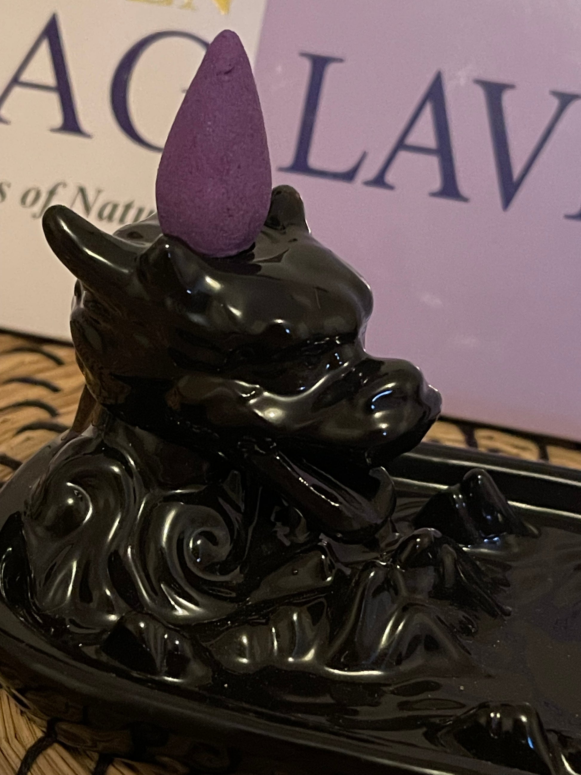 Denne dragen er en røkelsesbrenner for bruk av backflow røkelseskjegler for å oppnå effekten, Når du tenner en Røkelseskjegle på toppen, flyter røyken nedover gjennom brenneren og ut av dragens munn.