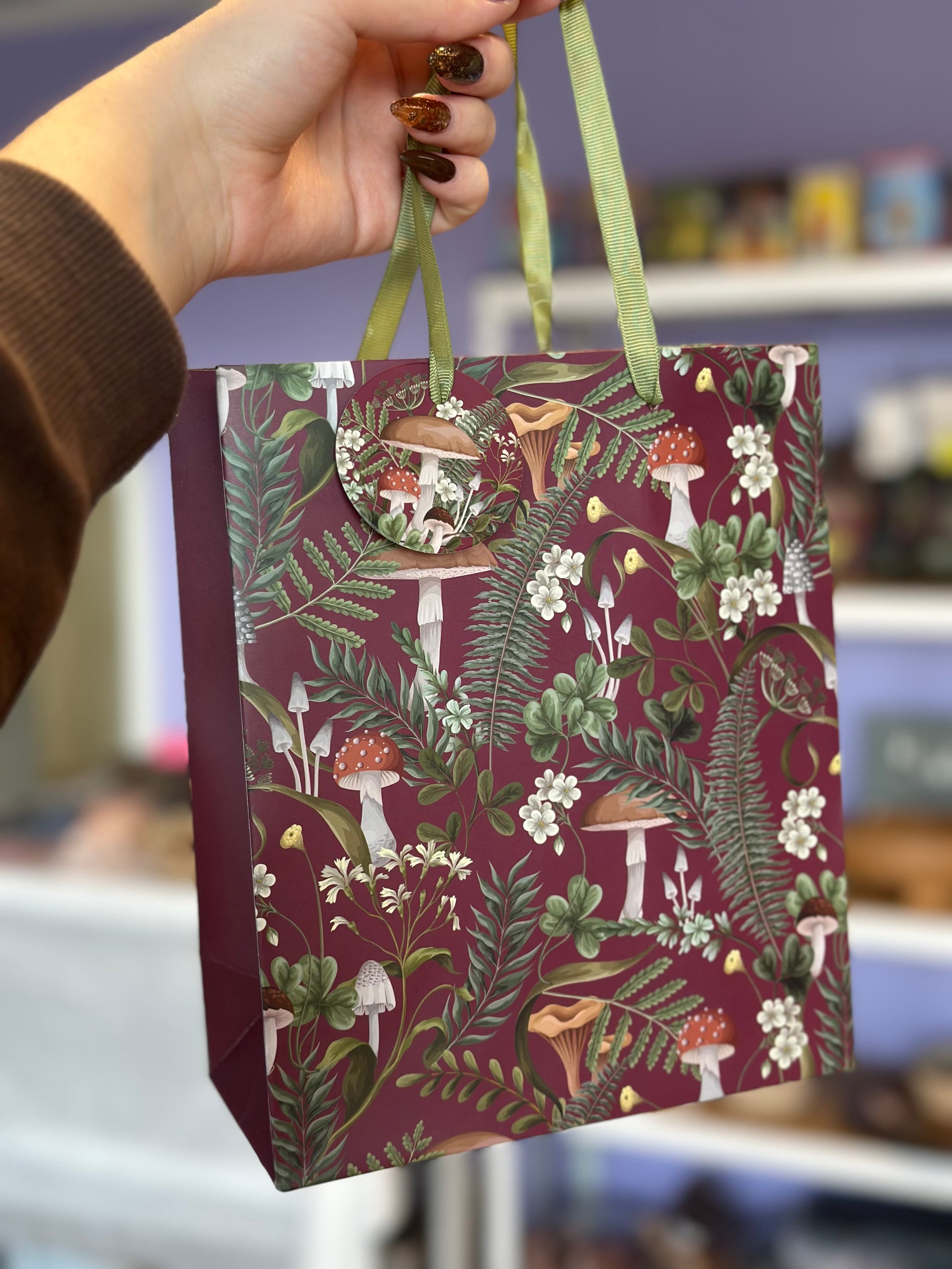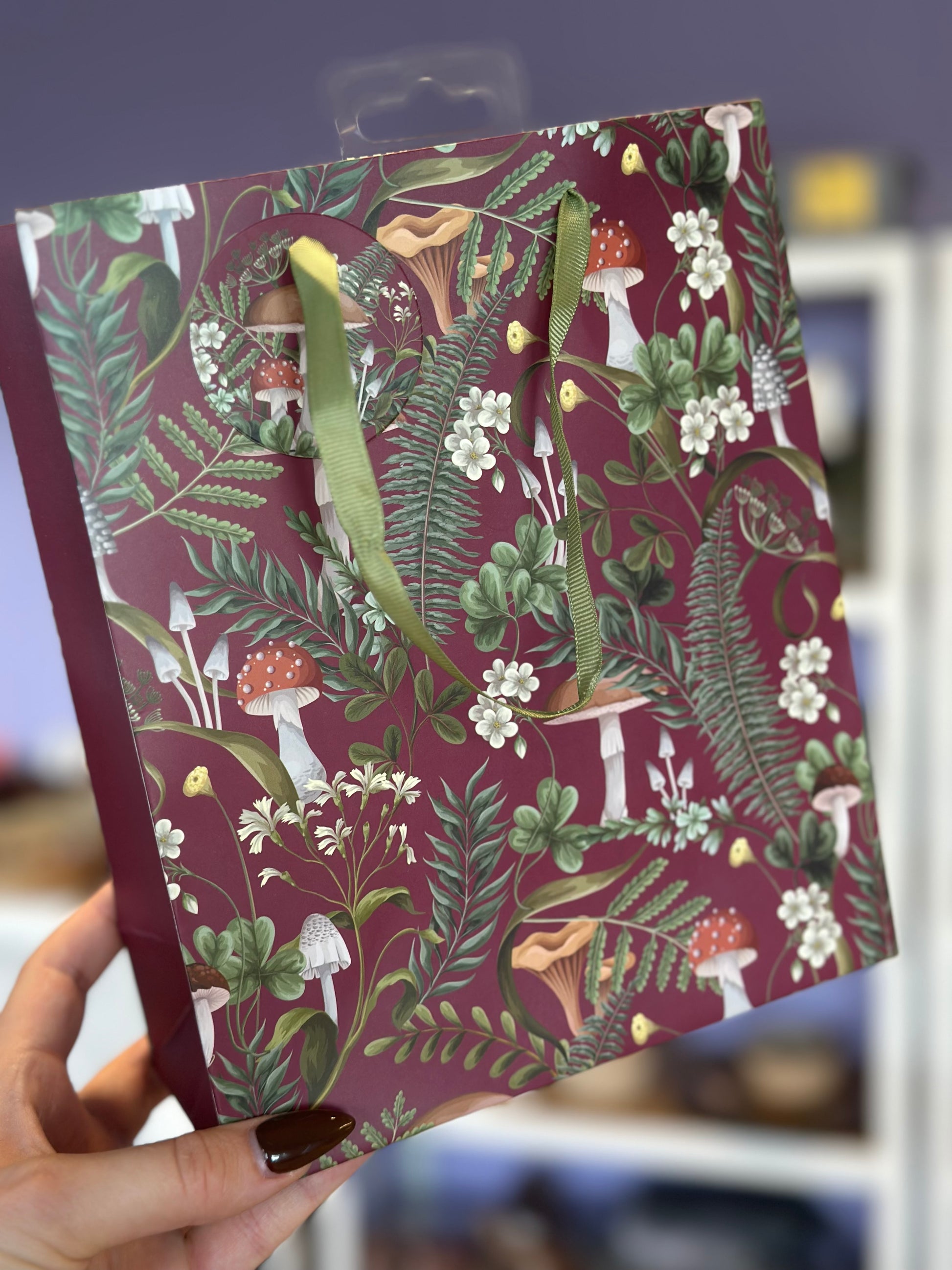 Gavepose burgunder / vinrød med sopp 23 cm