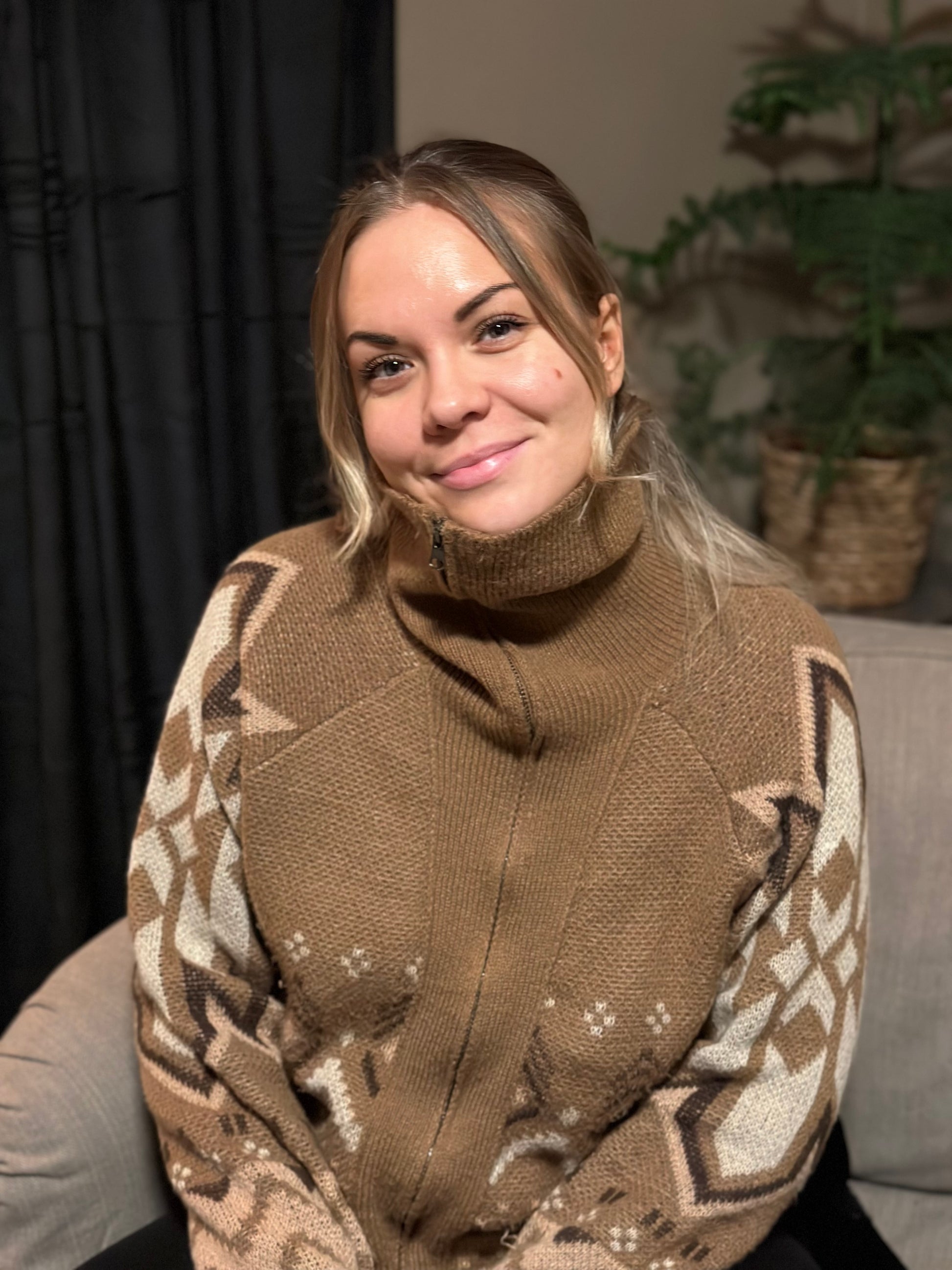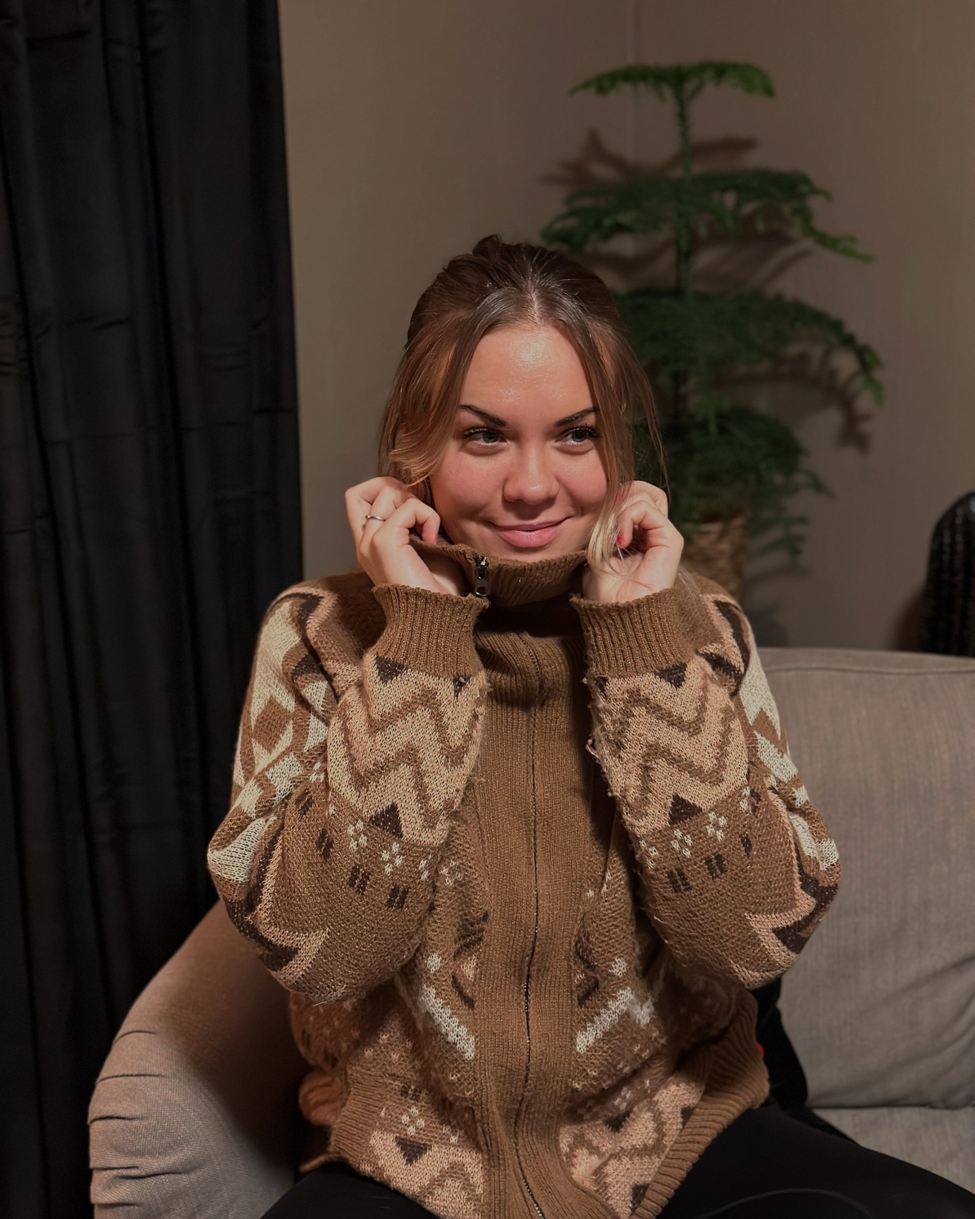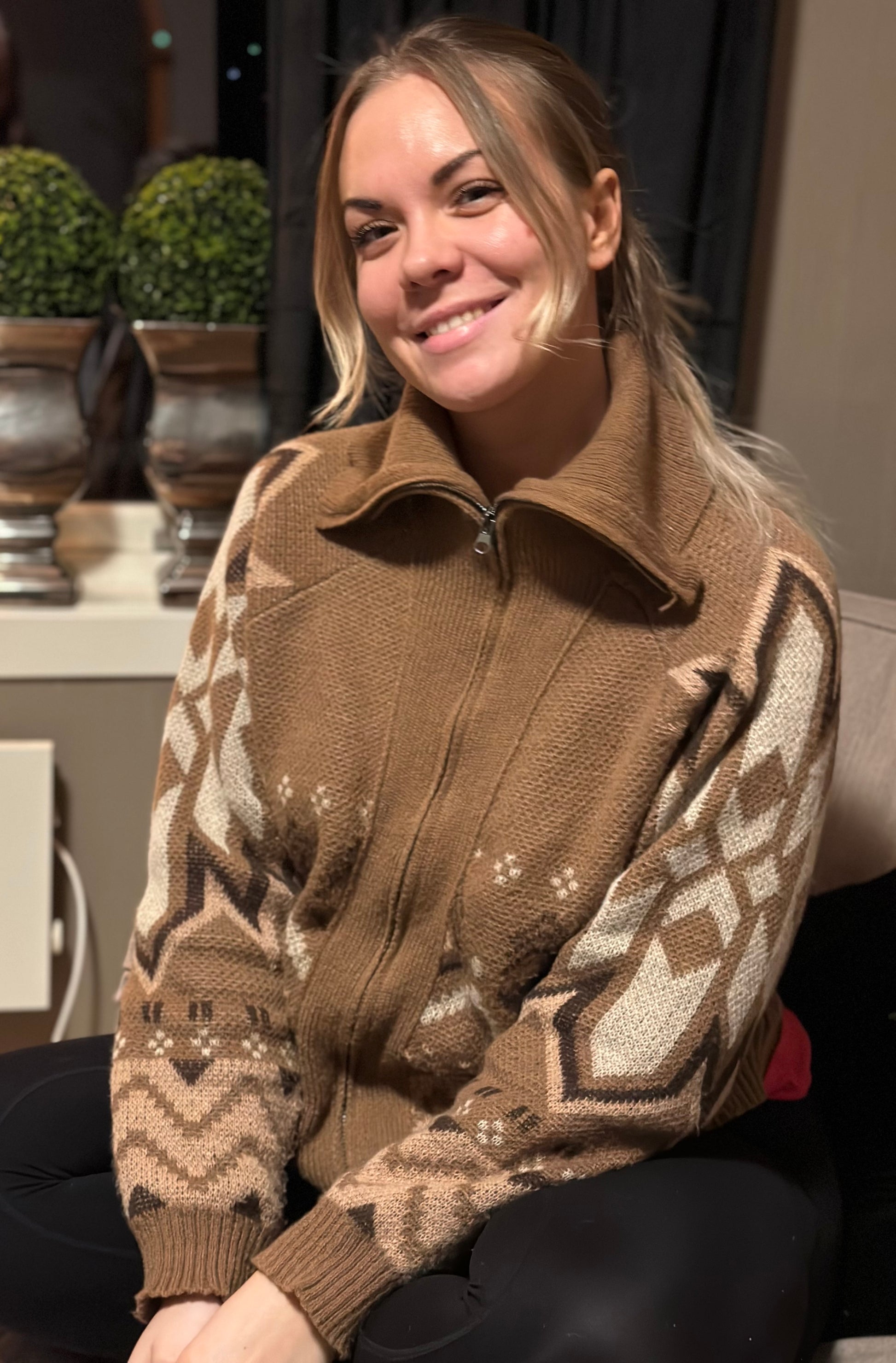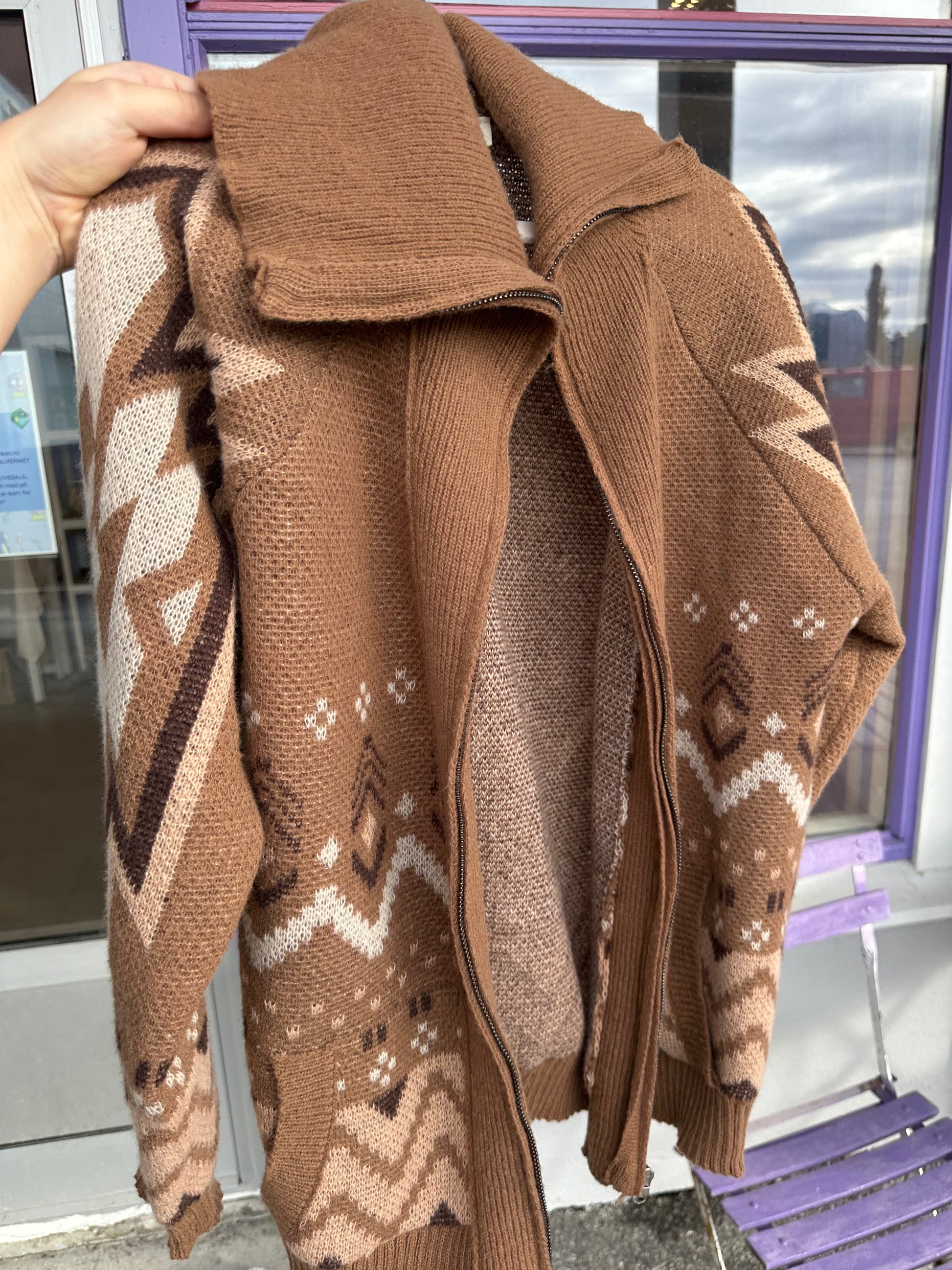 Mønstret brun jakke med glidelås og krage