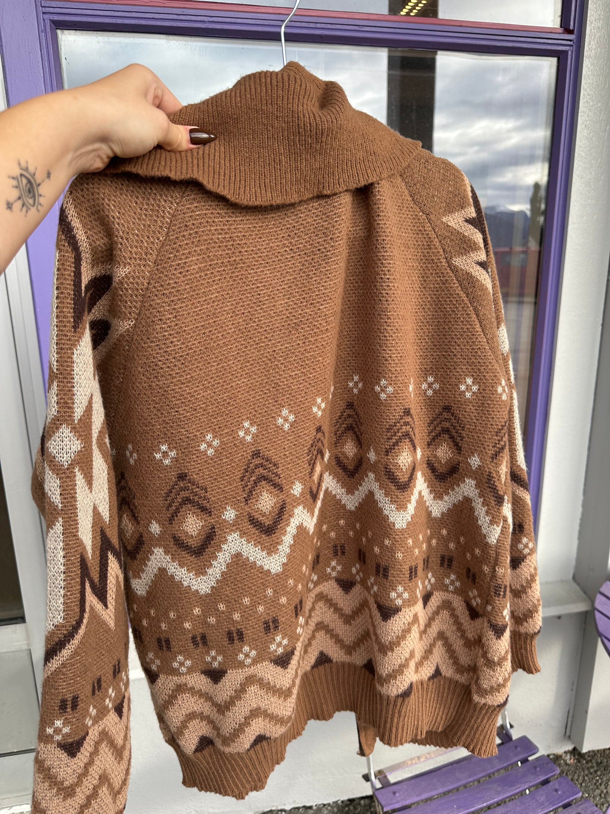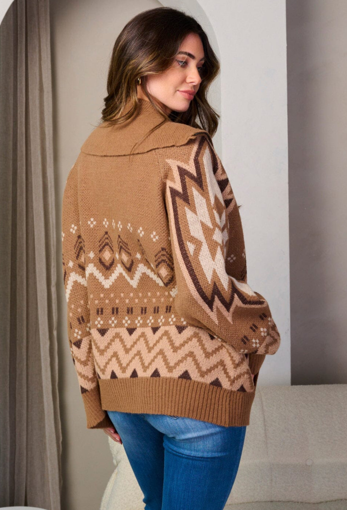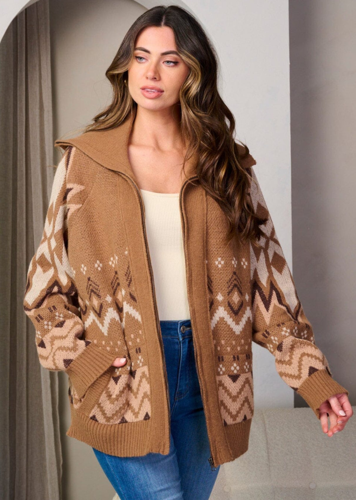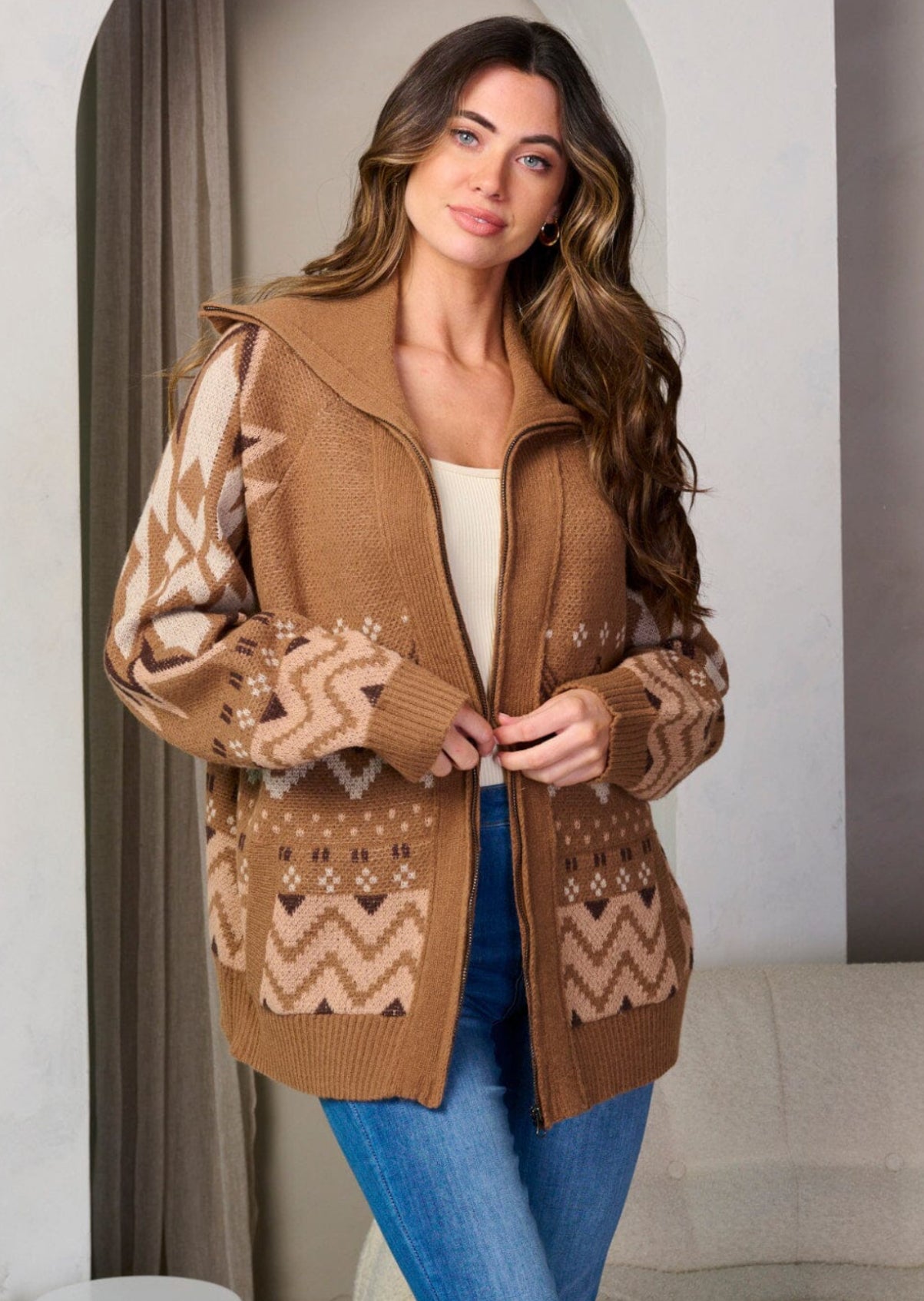 Mønstret brun jakke med glidelås og krage