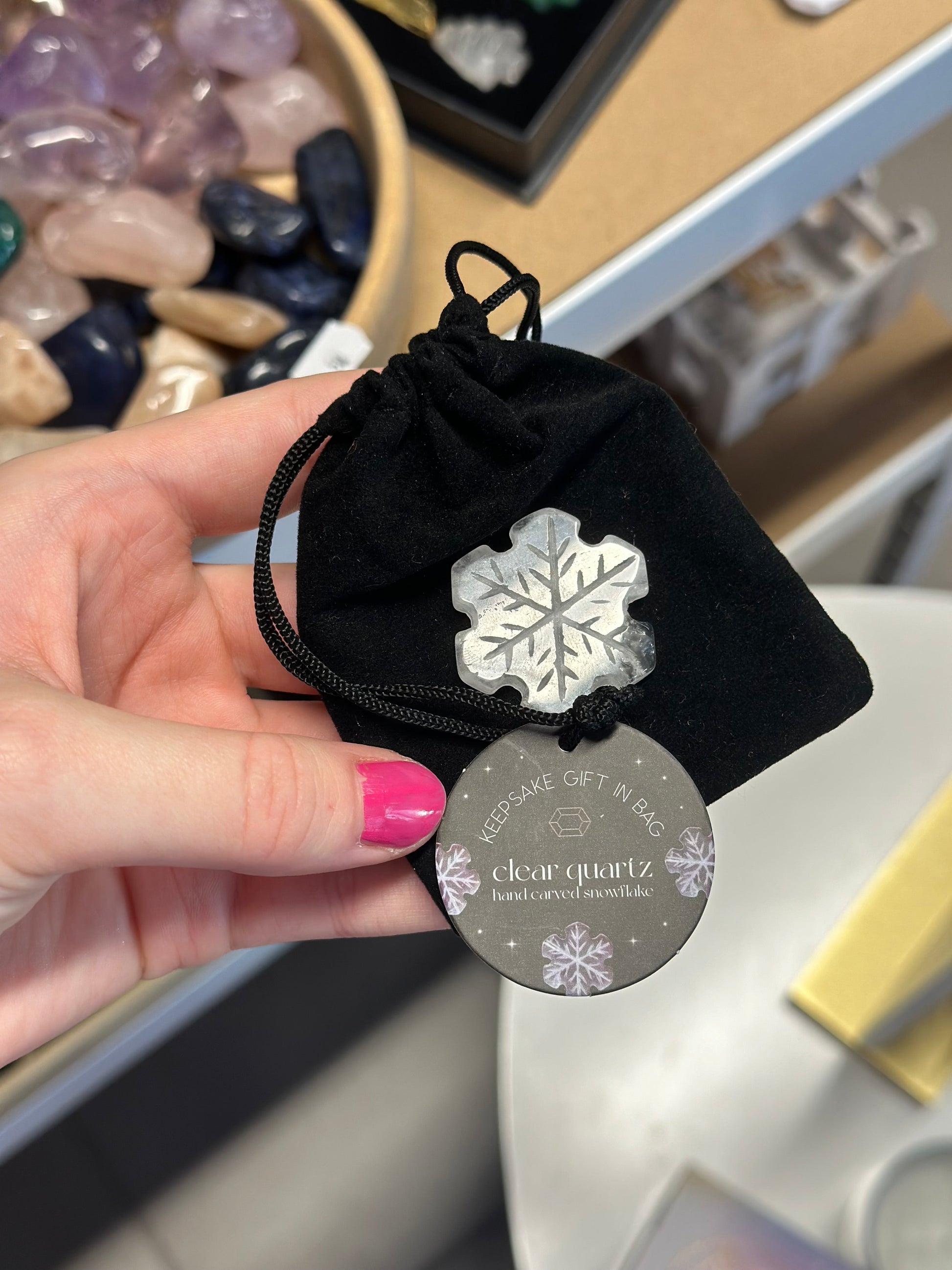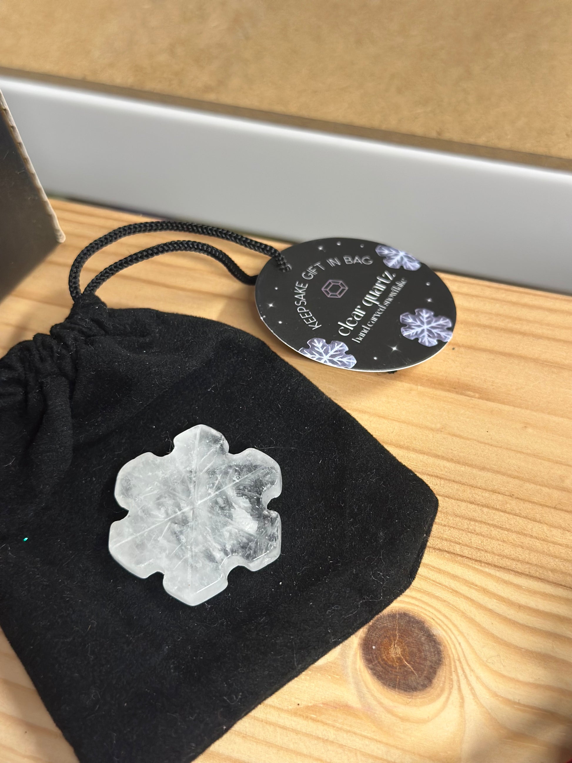 Snøfnugg snøflak bergkrystall i velur pose med lapp
