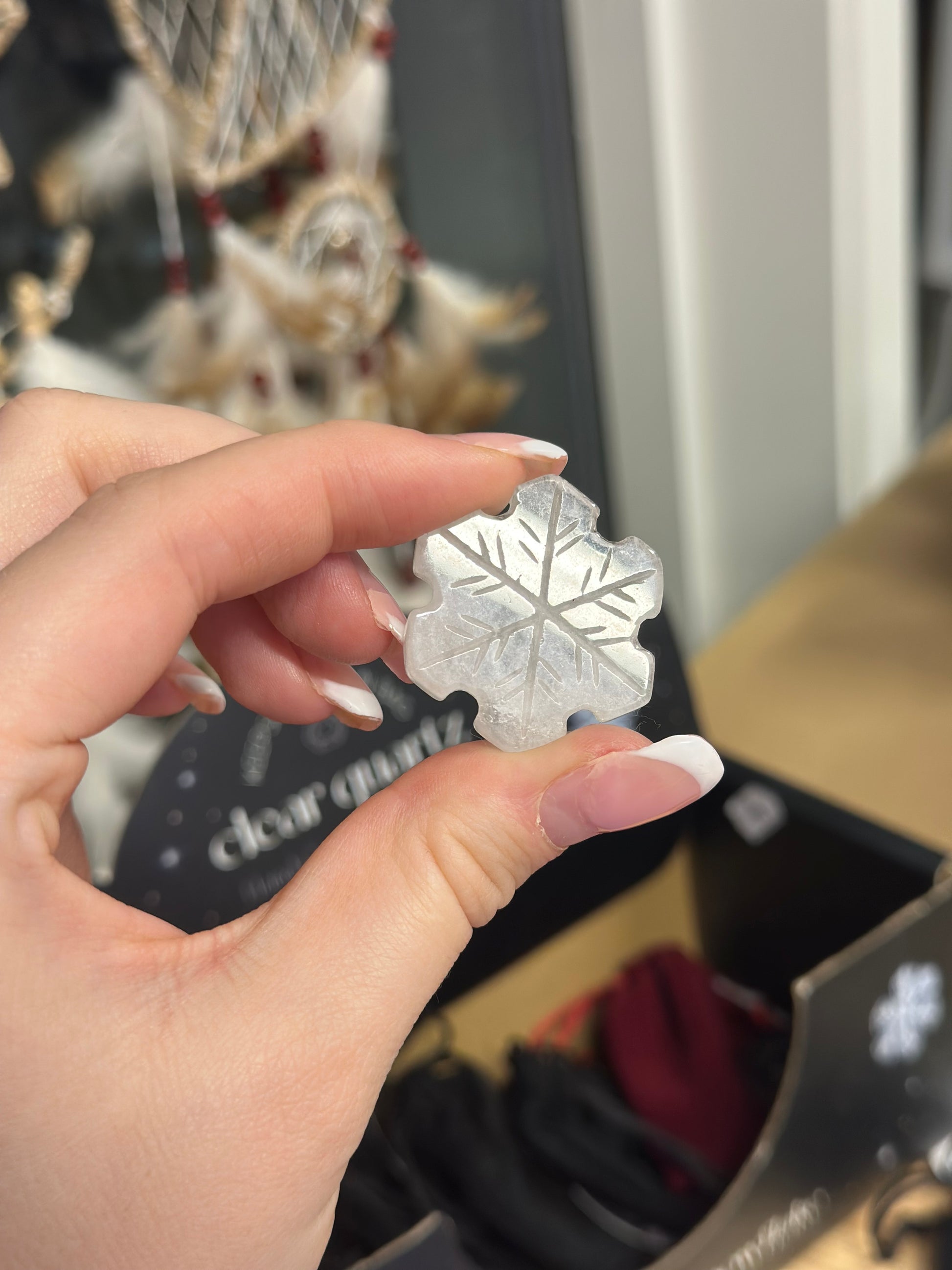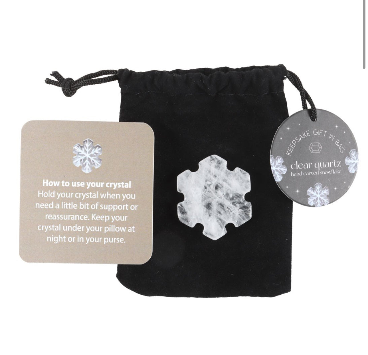 Snøkrystall i bergkrystall med velur pose til og lapp som beskriver litt av krystallen! Perfekt å dekorere med i juletiden. Bergkrystall står for blant annet klarhet, healing, positiv energi og balanse ❄️✨ Krystallene kan også variere noe i farge fra krystall til krystall.