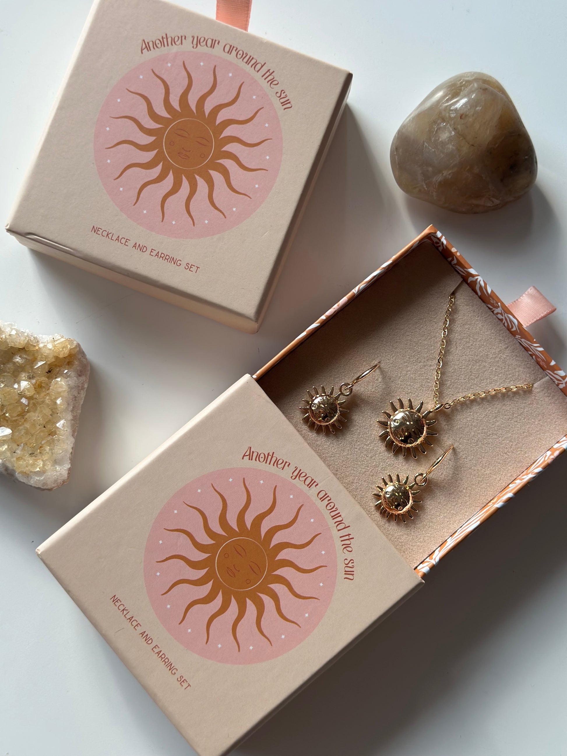 Solsmykke og øredobber med sol - gaveeske sett