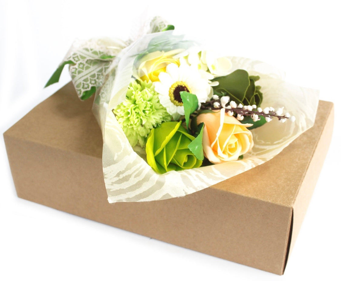 Rosene er laget av såpe og denne buketten er like fin på stue som på badet